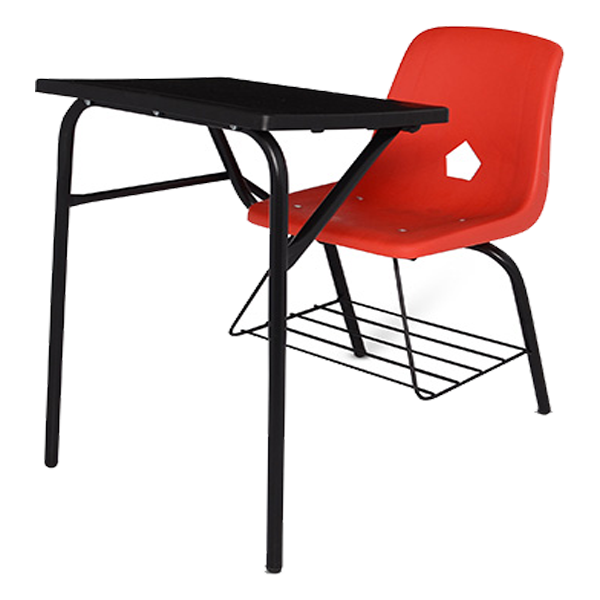 Estructura tubular redondo 1" Calibre 18. Parrilla portalibros en redondo macizo ¼”. Regatón de polipropileno antiderrapante ensamble a presión pegado a la estructura con adhesivos. Asiento y respaldo grande integrados en una concha de polipropileno de alta densidad. Diferentes colores. Cubierta de triplay de pino de 18mm de 48X40cm, recubierta con laminado plástico color teka. Acabada en pintura micopulverizada color negro. Altura piso al asiento 45 cm. Primaria Alta +.