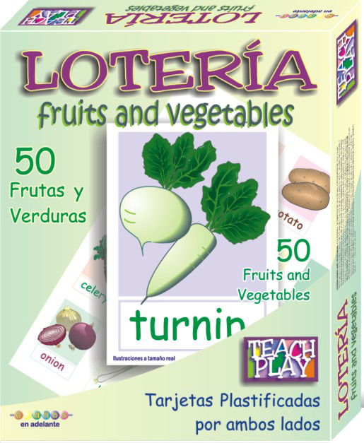 Tradicional juego de lotería de frutas y verduras en ingles. excelente material didáctico en ingles para facilitar el aprendizaje a través del juego. Contenido: 18 tableros y 50 tarjetas. Tamaño Aproximado: tableros 16x20 y tarjetas de 10x14 cms.