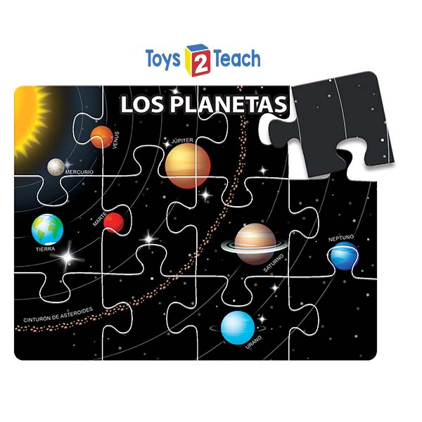 ¿Cuántos y cuáles son los planetas de nuestro sistema solar? Divertido rompecabezas para niños pequeños con el que pueden desarrollar vocabulario, observación, descripción y motricidad. Rompecabezas 21 x 27 cm de 12 piezas.