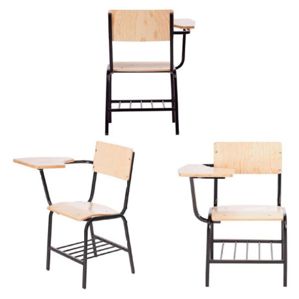 Estructura tubular redonda de 1" Calibre 18". Con parrilla portalibros de¼” en redondo macizo. Asiento y respaldo en triplay de pino de 12mm. Paleta en triplay de pino de 18mm para zurdos