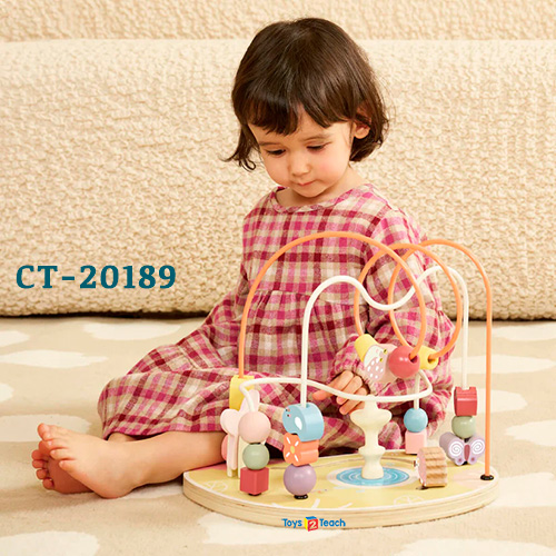 Medida 29.5 x 29.5 x 32 cm. Este alambre muestra una nueva energia con las cuentas decoradas con motivos de un precioso jardin. Tiene una elegante fuente, un simpatico erizo y varios tipos de cuentas y bolas que los niños y niñas pueden hacer subir y bajar por los rieles. Mejora su coordinacion ojo-mano y sus habilidades motoras finas