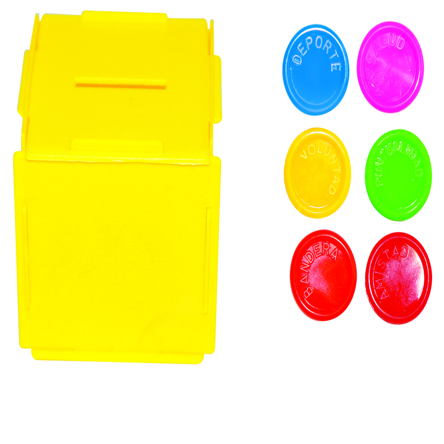 Es ideal para apoyar los programas de ética y valores pues de una manera diferente se puede reforzar en el alumno los comportamientos positivos, Presentación: charola con 2 alcancías y 96 fichas, Tamaño Aprox. alcancía 9 x 9 x 9 cm y fichas de 2.8 cm de diámetro, nivel preescolar y primaria.