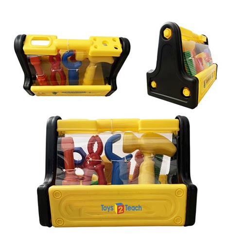 Presentación: Caja con 12 piezas de diferente es colores. Nivel: Preescolar y Primaria. Ya no será causa de preocupación. Los pequeños podrán aprender a usar sin ningún peligro, el martillo, el desarmador, las pinzas, el serrucho, la lima y una llave de tuercas. ¡Las herramientas de papá ahora en el tamaño y material adecuado para el niño!