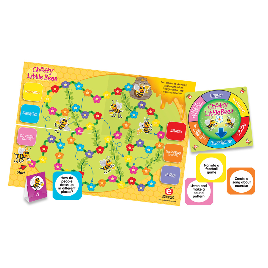 Divertido juego para desarrollar la expresión oral, la imaginación y comunicación. Practica la narración, la descripción, el atender instrucciones, mímica, crea una canción o una historia y actúa juego de mesa para 6 jugadores, contiene 1 tablero de 53 x 40 cms, 80 tarjetas de 4.5 x 4.5 cms, ruleta de 21 cms
