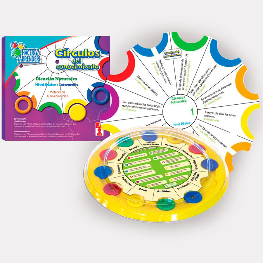 Material de autocorrección , que de una manera amena y diferente , permite al joven ejercicios de repaso de los conocimientos adquiridos durante el curso Presentación: caja con 1 plantilla y 12 tarjetas con 144 ejercicios Tamaño Aprox.: 28 cms de diámetro