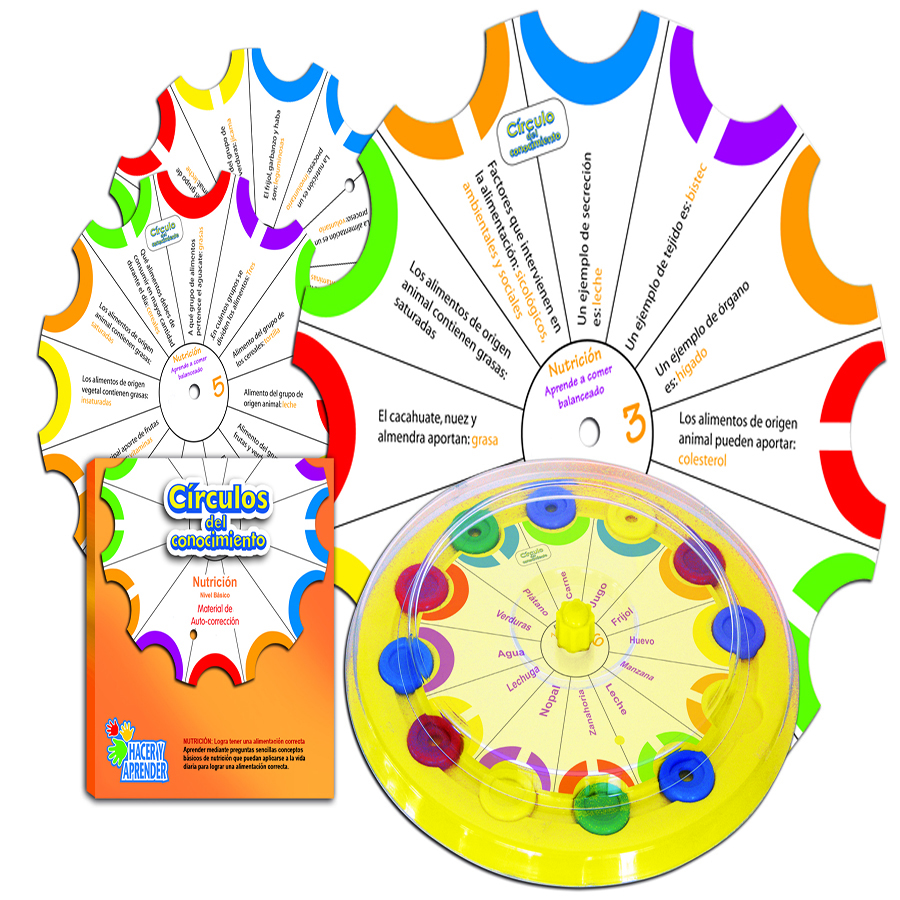 Innovador material educativo para la prevención de la obesidad. plantilla de autocorrección que permite realizar de una manera amena ejercicios de apoyo en el conocimiento de conceptos de nutrición en un nivel medio Presentación: 1 plantilla y 12 tarjetas con 144 ejercicios Tamaño: plantilla 28 cm de diámetro, tarjetas 21 cm de diámetro