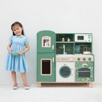Medida 90.7 x 33.8 x 90 cm . Contenido: 15 Piezas. Esta cocina de juguete de madera es predominantemente verde con preciosos motivos florales, lo que da como resultado un estilo retro clasico para que disfruten los niños. El conjunto incluye muchas areas funcionales como fregadero, cocina, armarios, lavavajillas y mas. Los niños pueden escribir los ingredientes que necesitan para prepararse o simular la accion de cocinar en la estufa, obteniendo una experiencia culinaria increible.