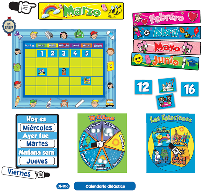 Este atractivo y útil paquete de material no debe de faltar en tu salón de clases ya que será de gran apoyo para tu programa anual. Aunado a esto, hace visualmente mas atractivo tu salón de clases. con el podrás hacer divertidas actividades tales como planificar tus eventos, tener informados a tus alumnos del clima, efemérides, ubicar al alumno en la estación del año en la que se encuentre en su momento, por mencionar algunas ideas. Incluye: 1 lámina de calendario(43.5 x 61 cm) 1 gráfica de las estaciones (29 x 32.5cms) 1 gráfica del clima (29 x 32.5cms) 31 número de calendario 39 tarjetas de festividades 1 gráfica de los días de las semana (18.5 x 21.8 cms) 12 letreros de los meses del año (40.7 x 7.5 cms)