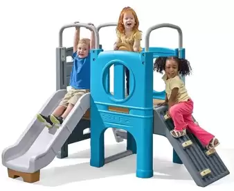 Características como las paredes para escalar, el tobogán al aire libre y el volante permiten practicar las habilidades motoras gruesas, la coordinación ojo-mano y el equilibrio durante el juego.