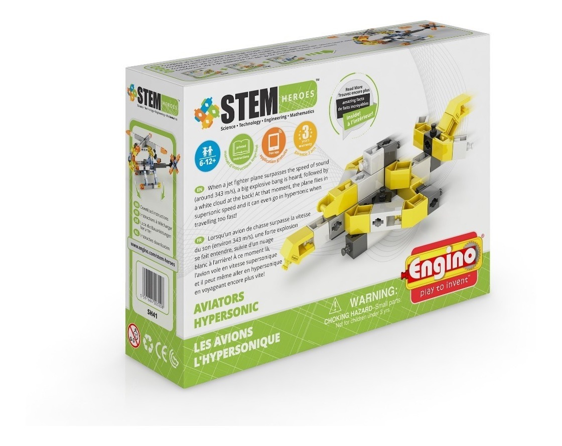 HEROES Aviators: HIPERSÓNICO ¿Sabías que se puede viajar a mayor velocidad que el sonido? Imagínalo con la nueva serie STEM Heroes de aviones Incluye 40 piezas del sistema Engino para construcción, de formas variadas, y cuaderno con teoría, exámenes e instrucciones de armado. Las instrucciones interactivas 3D de los proyectos incluidos y los combinados están disponibles a través de la aplicación 3D KidCAD para dispositivos inteligentes. Edad recomendada: 6 a 12 años
