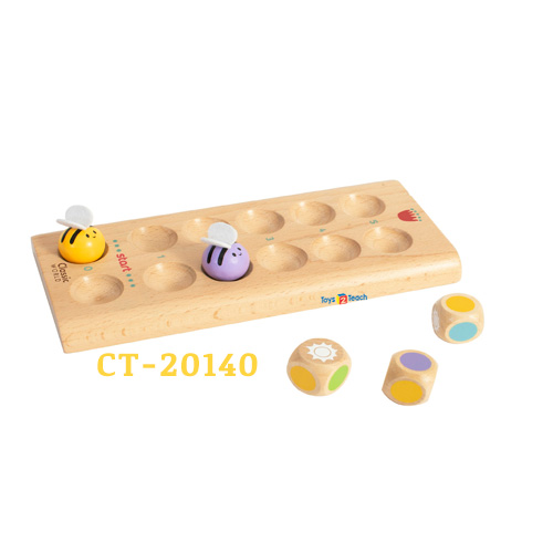 17.8 x 8 x 3.5 cm 6 Piezas. ¡Juguemos al juego de carreras! Los niños usan el patron de los dados para decidir si las abejas avanzan o retroceden y comparan quien llega primero al final.