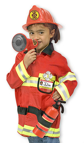 Edad: 3+, aquí¡ esta todo lo que tu bombero necesita para un caso de emergencia: una chaqueta de color rojo brillante, lavable a máquina con adornos de material reflectante, un casco de jefe de bomberos, un "extintor", un megáfono con efectos de sonido, una insignia brillante y una etiqueta para poner el nombre y personalizar este traje.