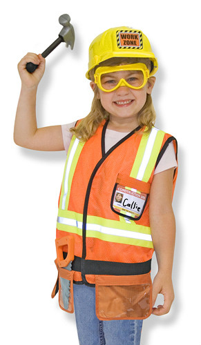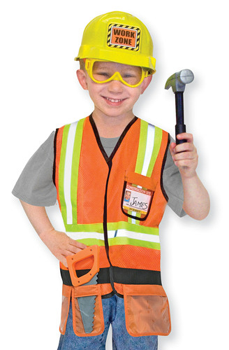 Edad: 3 a 6 años, zona de trabajo enfrente! su pequeño trabajador de la construcción estar listo para llevar a cabo el trabajo con este traje color naranja brillante, lavable a máquina, chaleco de relieve con material reflectante y un cinturón de herramientas, un casco amarillo, gafas de "seguridad", un martillo, una sierra, y una etiqueta con su nombre para personalizar.