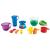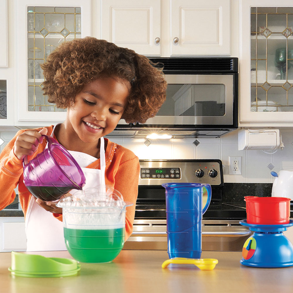 ¿cuánto cereal puedes poner en el tazón rojo? ¿ cuanta leche cabe en la jarra azul? para mezclar la leche y el cereal que tazón necesitas? con este set los niños podrán jugar y manipular líquidos y solidos que al mezclaros formarán diferentes volúmenes, los cuales los podrán observar con el tazón medidor que elijan, identificarán que el mismo contendido, se ve diferente en un tazón mas alto o ancho pero con la misma capacidad
