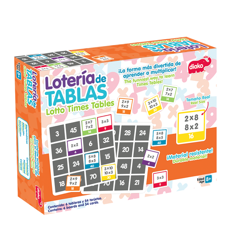 Lotería de cartón para aprender las tablas de multiplicar. Para ganar hay que saber los resultados de las multiplicaciones de tu tablero y completar una línea de 4 lo más rápido posible. Ayuda al aprendizaje de las tablas de multiplicar, al desarrollo lógico-matemático, al razonamiento y a la memoria. Medida: 20 x 20 x 3 cm. Piezas: 6 tableros y 54 tarjetas. Edad: 7+