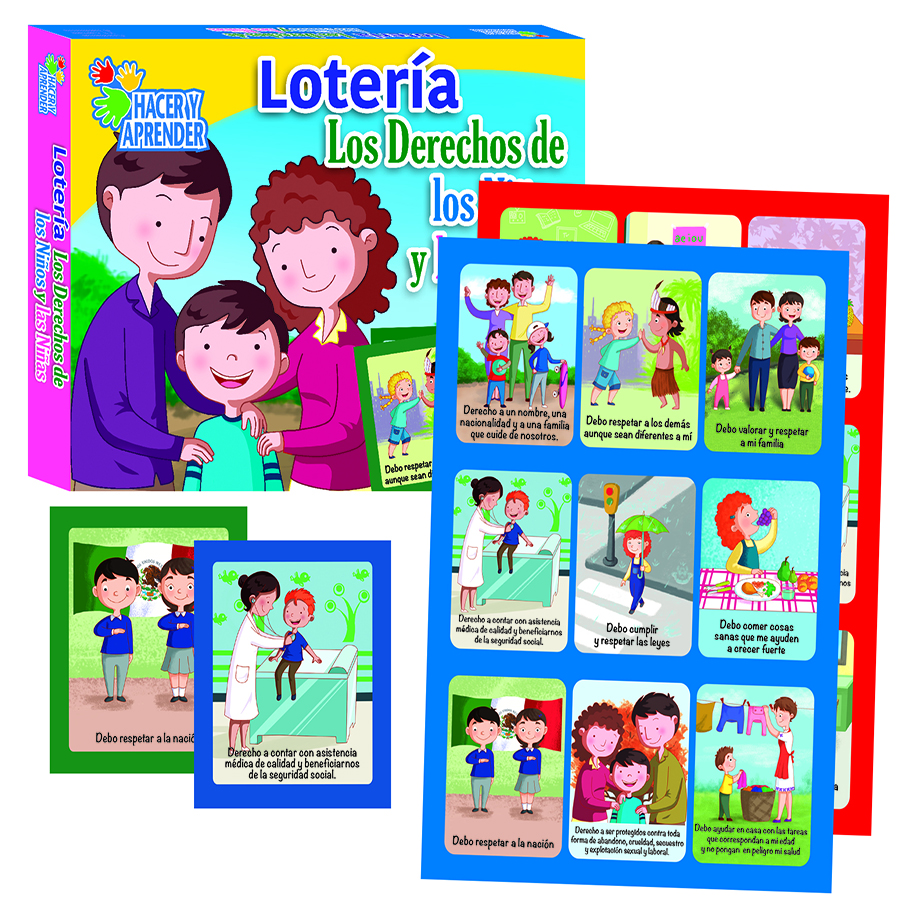 Divertido juego similar a la “lotería tradicional "en lo que buscamos al cantar las cartas es ir completando nuestros tableárosla singularidad de este es que contiene los textos ilustrados de los derechos y los deberes de los niños y las niñas lo que permite de una manera lúdica informar a nuestros alumnos de este tema Presentación: 6 tableros y 21 tarjetas Tamaño: 23 x 29 x 3.5 cms
