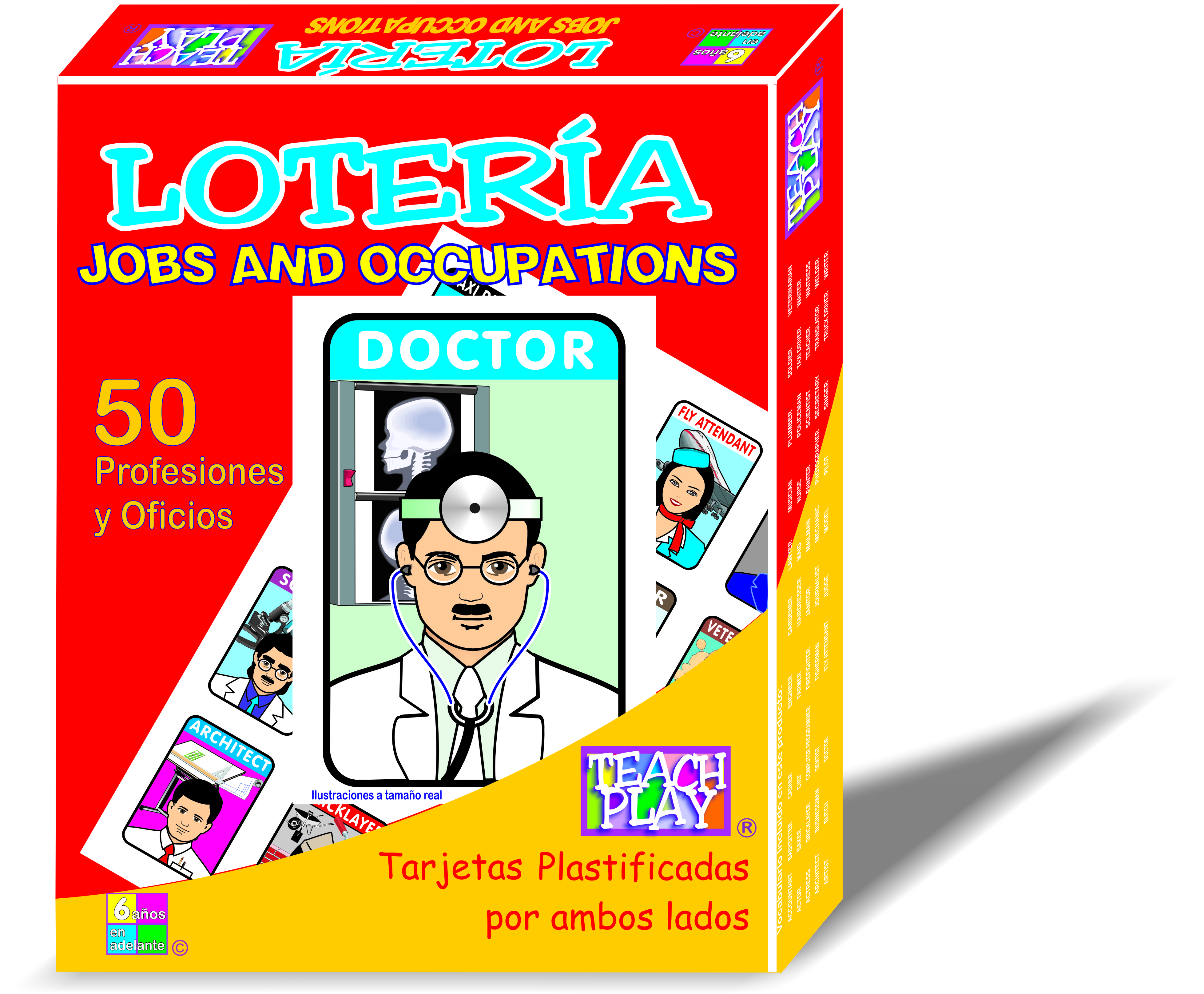 Tradicional juego de lotería de profesiones y oficios en ingles. excelente material didáctico en ingles para facilitar el aprendizaje a través del juego. Contenido: 18 tableros y 50 tarjetas. Tamaño Aproximado: tableros 16x20 y tarjetas de 10x14 cms.