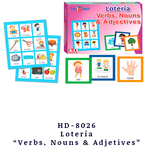 Material lúdico-gráfico que apoya al maestro en la enseñanza de la gramática del idioma inglés, estableciendo las diferencias entre verbos, sustantivos y adjetivos. Presentación: 8 Tableros y 60 tarjetas impresas en cartulina. Material: Cartulina sulfatada. Nivel: Primaria