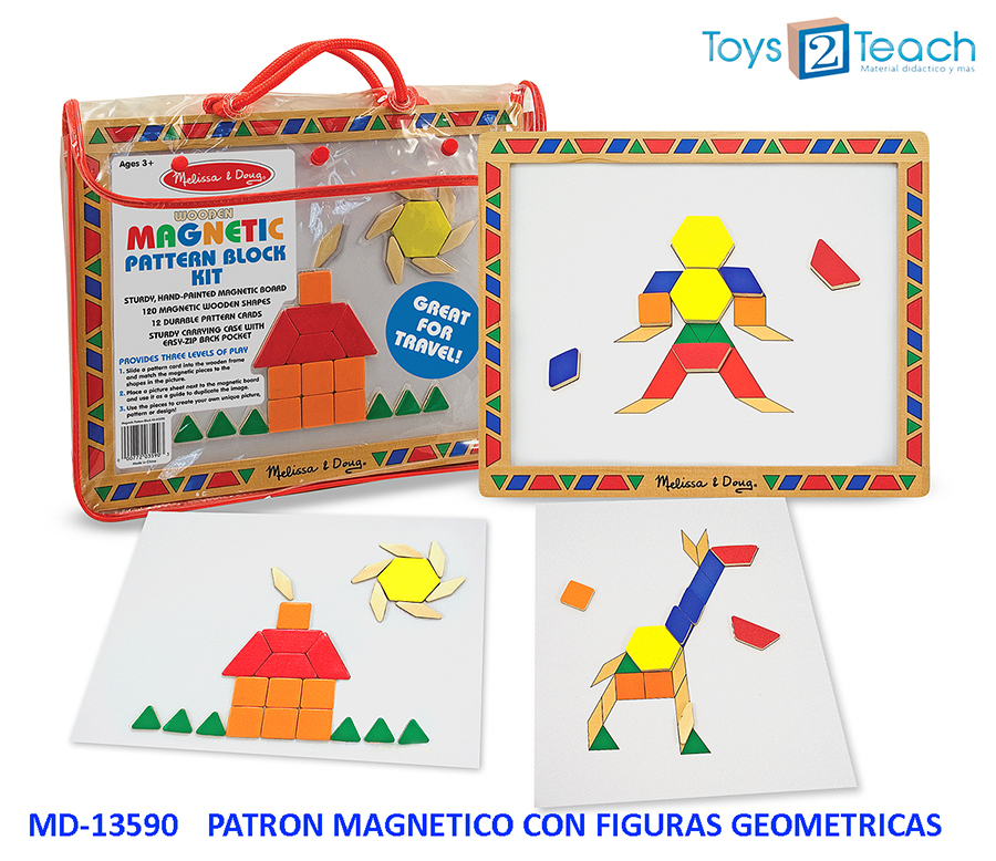 Edad: 3+ Pizarra magnética de madera, incluye 120 imanes geométricos de colores. crea patrones de mosaico y figuras directamente en la placa magnética. Este set viene empaquetado en un cómoda funda protectora de plástico con asas resistentes.