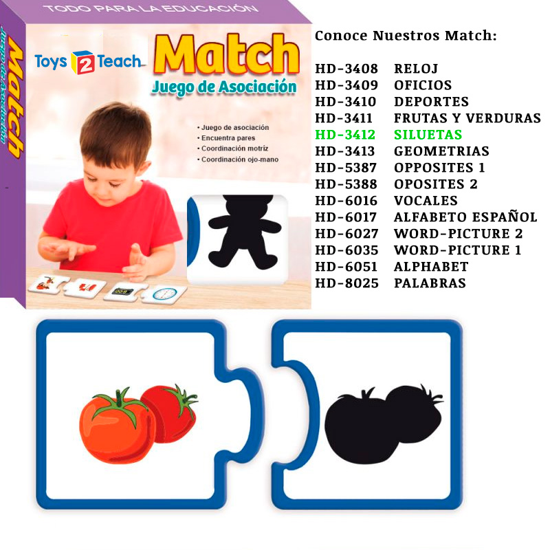 El uso de este material le permitirá al niño conceptualizar el termino figura silueta, trabajara la memoria y la relación que tiene con objeto- silueta. Además podrá conocer las similitudes y diferencias entre las diferentes figuras, trabajando con su ubicación espacial. 24 piezas de 8.5 x 7 cm