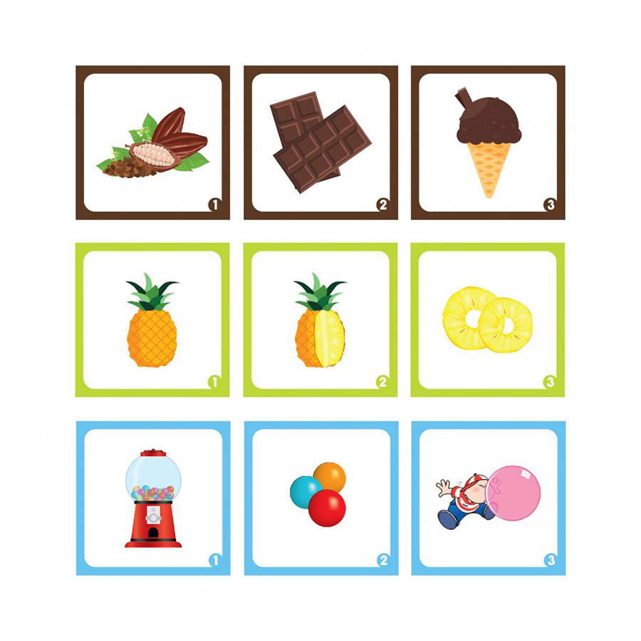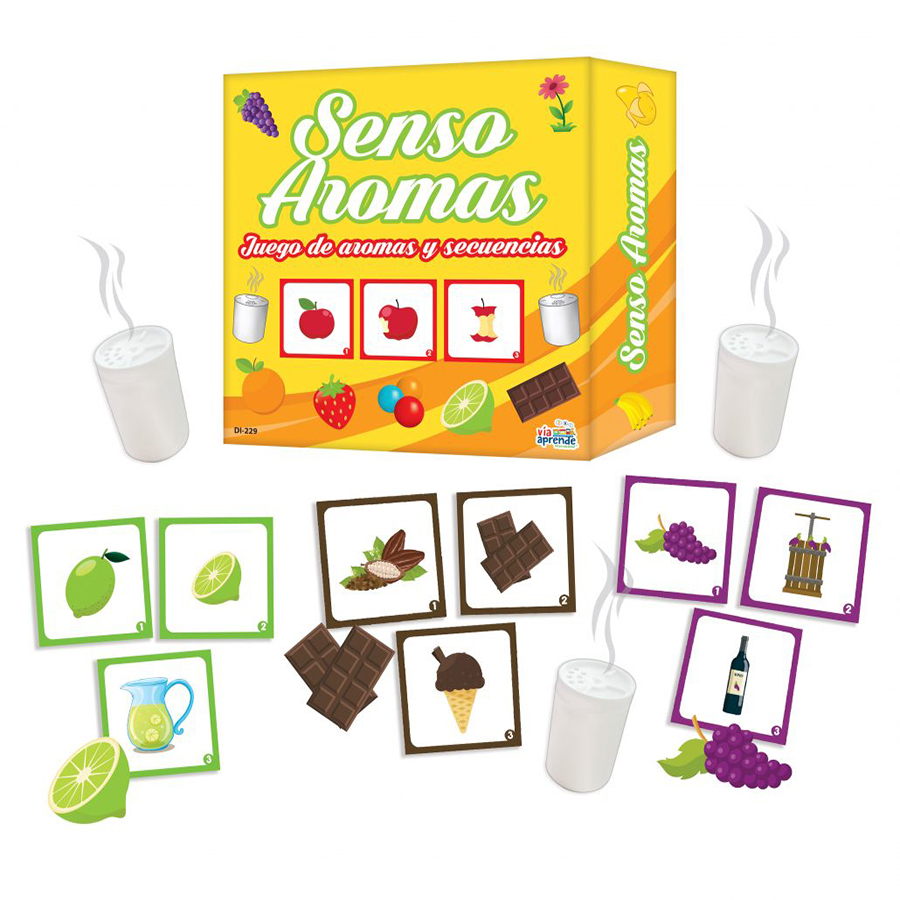 Este material está principalmente desarrollado como juego de mesa para el público en general, así mismo es de gran utilidad para terapeutas, docentes, alumnos y padres de familia, para hacer del sentido del olfato un aprendizaje adaptado al nivel de cada persona, así también para aquellos que tengan una deficiencia y privaciones sensoriales dando así un significado a esos aromas.Este juego será beneficioso para crear conceptos de los olores asociándolos con realidades cotidianas(por ejemplo: planta de cacao-barra de chocolate y helado de chocolate) y conocer sus procesos. Por otro lado, las atractivas tarjetas de secuencias, ayudarán al alumno a asociar el aroma con el dibujo, logrando así dar un significado a cada uno y a su vez, discriminar aromas dulces-amargos-ácidos-suaves-fuertes, etc. Objetivos. · Reconocer los diferentes aromas y dar significado a cada uno de ellos. · Estimular nuevas experiencias sensoriales. · Traducir la sensación del olor en percepción olfativa. · Estimular el vocabulario a través de las diversas dinámicas con los aromas y las secuencias. CONTENIDO: El juego consta de 12 botecitos con aromas de (uva-fresa-mago-piña-plátano-manzana-café-chocolate-chi- cle-flores-naranja-limón). Y 36 tarjetas para 12 juegos de secuencias de 3 etapas con cada uno de los aromas. Todos los envases cuentan con el nombre impreso por el reverso del envase.