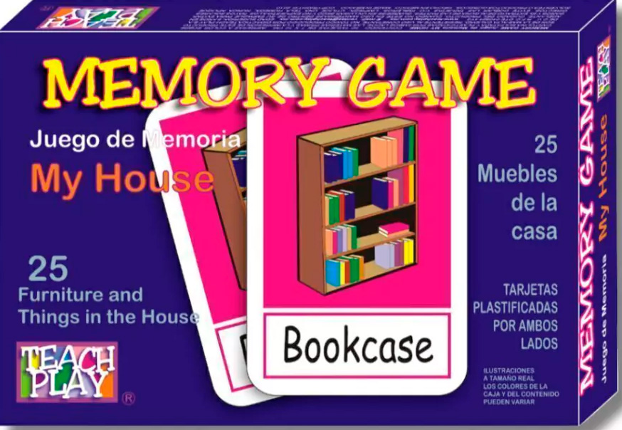 Juego de memoria con 25 diferentes muebles de la casa. excelente material didáctico para que los niños aprendan ingles jugando. tarjetas impresas a color y plastificadas por ambos lados. Contenido: 50 tarjetas. Tamaño Aproximado: tarjeta 7x10 cm.