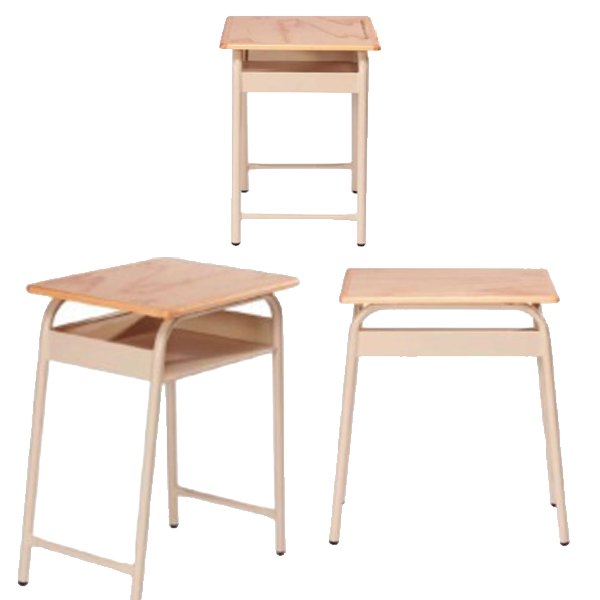 Estructura a base de dos piezas en tubular redondo de 1” calibre 18 en pintura micropulverizada color beige y cubierta en triplay de madera de pino de 18 mm. de espesor y marco perimetral de madera maciza de ¾” con esquinas redondeadas y acabadas en barniz natural. Con papelera en lamina calibre 20.