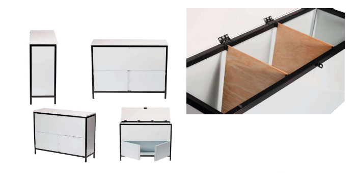 120X40X90cm. Estructura en tubular cuadrado color negro. Cubierta abatible de madera aglutinada recubierta en laminado plástico blanco.
