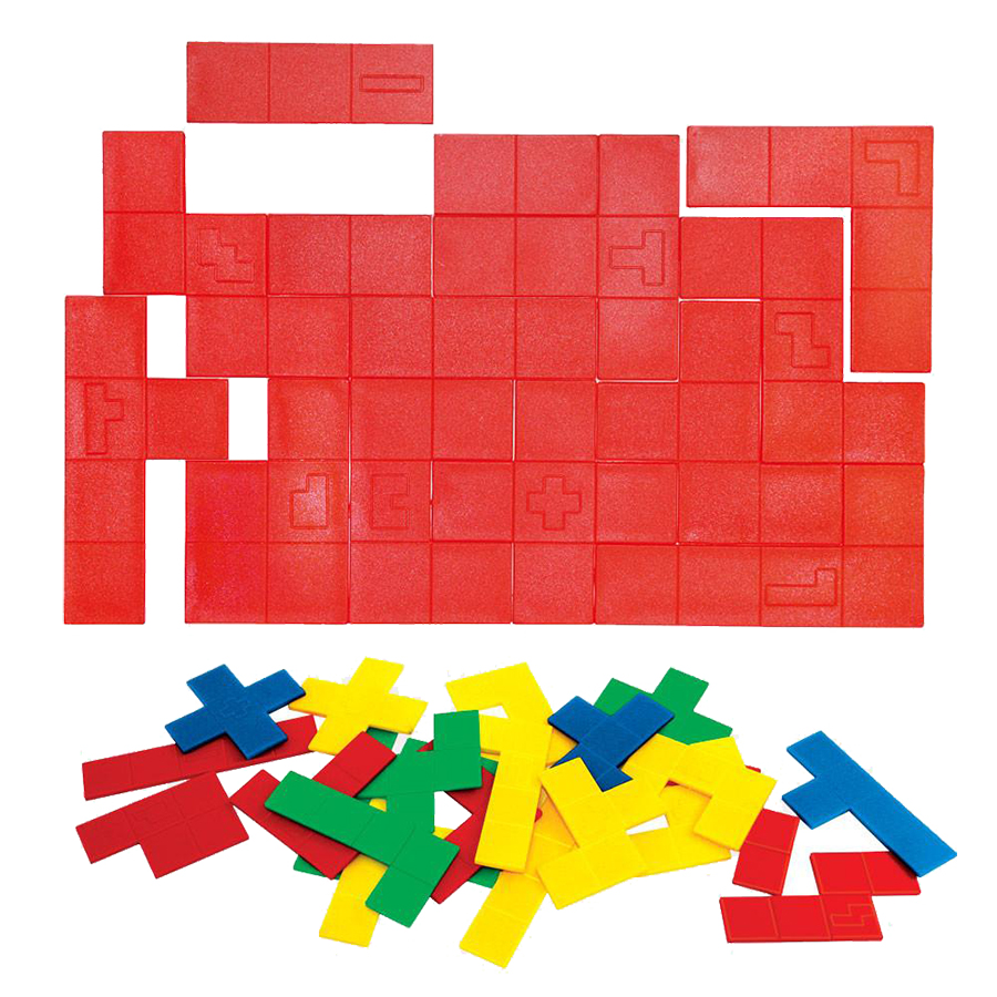 Con este juego el alumno desarrolla conceptos matemáticos al tener en cada pieza 5 unidades cuadradas de 1.5 x 1.5 cm, concepto mediante el cual se introduce en la base 5, también proporciona habilidad en el desarrollo de figuras geométricas planas sin espacios vacíos. Presentación: 48 piezas en colores rojo, amarillo y azul Tamaño Aprox.: Unidades cuadradas de 1.5 x 1.5 cm.