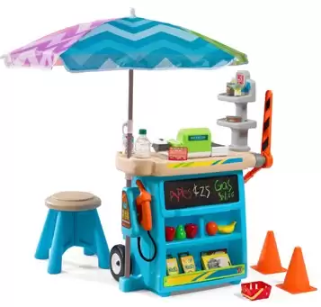 En la caja: Base de mercado móvil con ruedas, sombrilla de 40”, taburete, 2 conos de tráfico y brazo de peaje, pizarra y caja registradora electrónica.