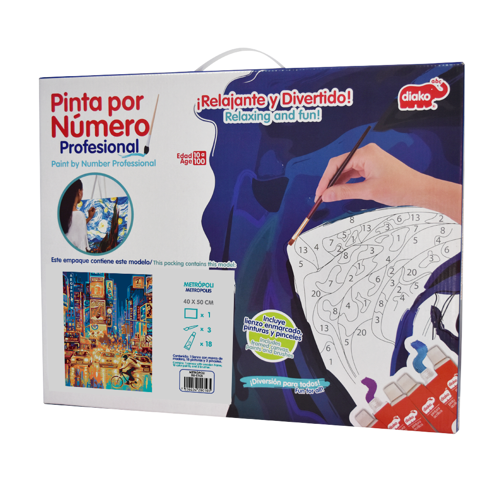 El tiempo de creatividad reduce el estrés, relaja la mente y el cuerpo, además de ser divertido. Pinta por número profesional contiene un lienzo en marco de madera, pinturas numeradas, paleta de pintor, 3 pinceles, bolsa de manta guarda fácil, instructivo y tips para pintar como profesional. ¡Con pinta por número crea obras de arte en forma sencilla! Simplemente haz coincidir el número de la pintura con el impreso en el lienzo y rellénalo. Medidas: 40x50 cm