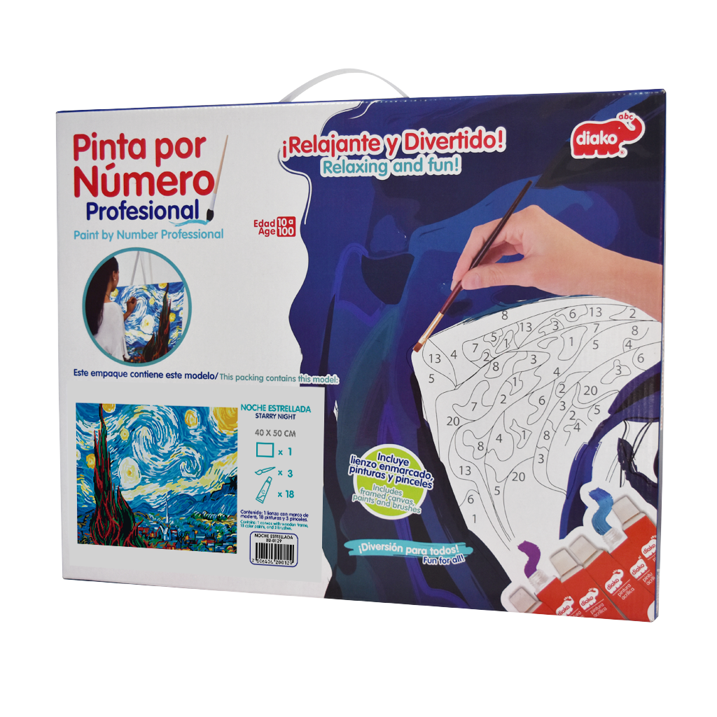 El tiempo de creatividad reduce el estrés, relaja la mente y el cuerpo, además de ser divertido. Pinta por número profesional contiene un lienzo en marco de madera, pinturas numeradas, paleta de pintor, 3 pinceles, bolsa de manta guarda fácil, instructivo y tips para pintar como profesional. ¡Con pinta por número crea obras de arte en forma sencilla! Simplemente haz coincidir el número de la pintura con el impreso en el lienzo y rellénalo. Medidas: 40x50 cm