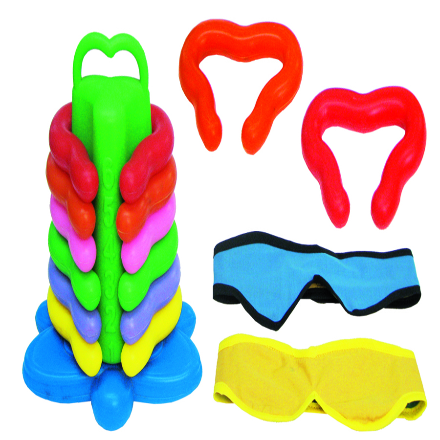 Actividad que permite mejorar las capacidades psicomotoras y sensoriales del niño en una actividad a ciegas en donde el niño identifica el número de piezas ensartadas con el número en alto relieve marcado en la campana Presentación: charola jr. con tapa con dos pirámides 14 aros y 2 antifaces Tamaño Aprox. 30 x 15 cm nivel preescolar