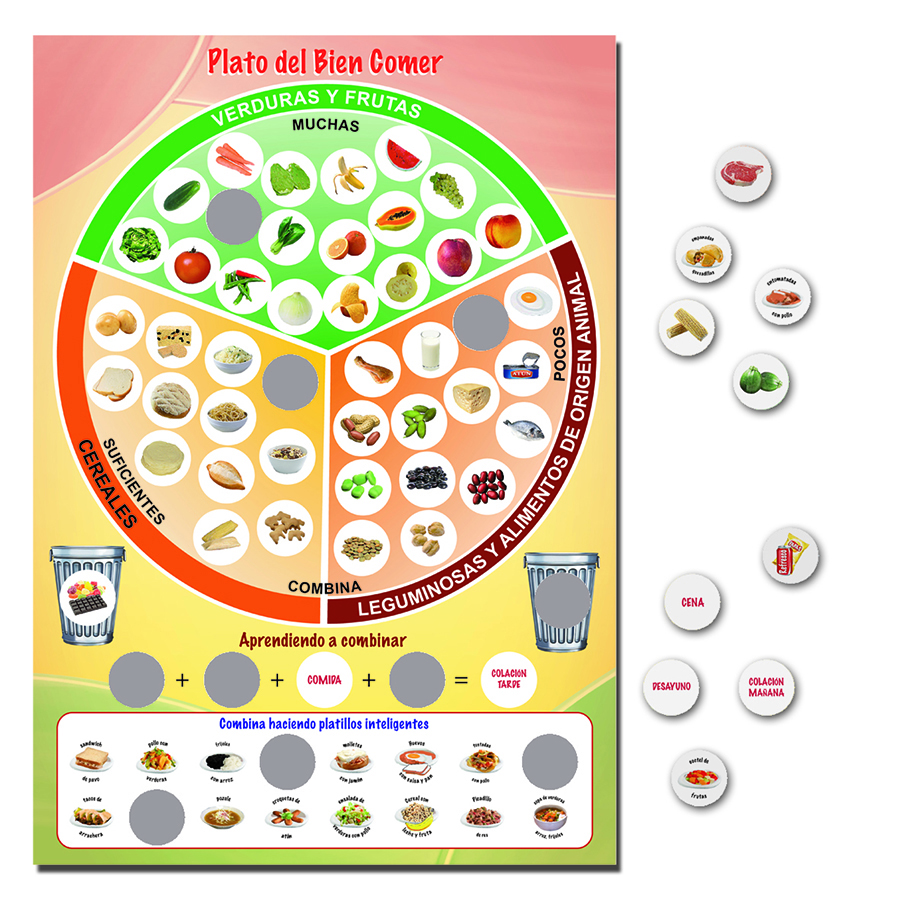 Enseña a los niños y jóvenes a clasificar los alimentos y a combinarlos de acuerdo a los diferentes grupos a los que pertenecen, Presentación: 1 juego, Tamaño Aprox. 30 x 43 cm nivel primaria y secundaria.