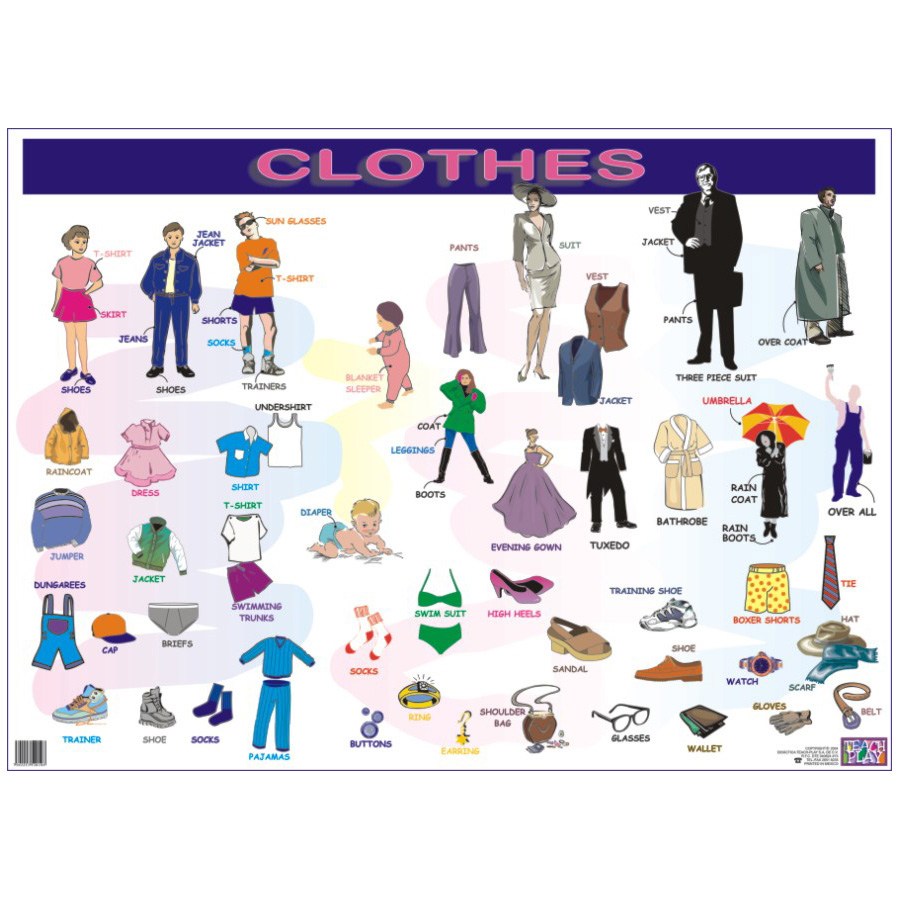 Póster plastificado de prendas de vestir en inglés. excelente material didáctico en inglés para el salón de clases. Contenido: 1 pieza. Tamaño Aproximado: 70x95x1 cm.