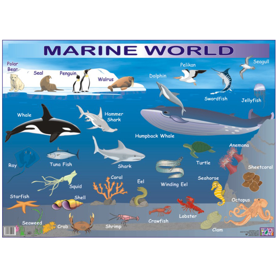Poster plastificado de los animales del mar en inglés. excelente material didáctico para la enseñanza de los nombres de los animales marinos en inglés. Contenido: 1 pieza. Tamaño Aproximado: 70x95x1 cm.