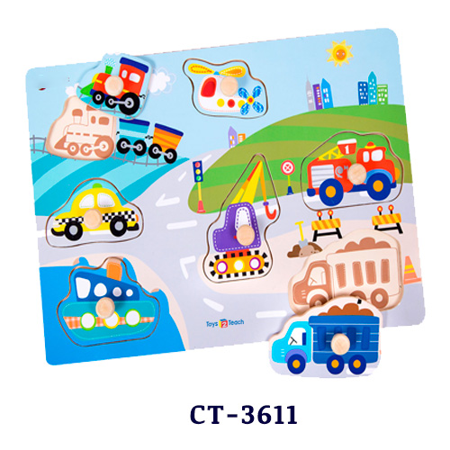 8 piezas 30x21 x2cm. Nuestro tablero de vehiculos de 8 piezas, con tematica de Transportes tiene pijas pequeñas, adecuadas al tamaño de los dedos de los niños para un facil manejo. El niño aprendera a nombrar e identificar vehiculos de transporte y a asociar la pieza encajable con la imagen impresa en el tablero. Fomenta la resolucion de problemas y el descubrimiento.