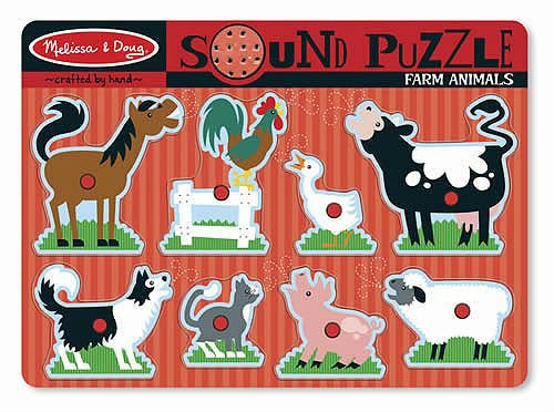 Edad: 2+, 8 Piezas. rompecabezas de pijas con sonido. escucha las voces de los ocho animales de la granja cuando las piezas del rompecabezas se colocan correctamente en el tablero. cada pieza de un animal tiene una coincidencia con la imagen a todo color que se encuentra en el tablero. favorece la coordinación mano-ojo, ayuda a incrementar la habilidad de escuchar , identificar y relacionar sonidos e imágenes