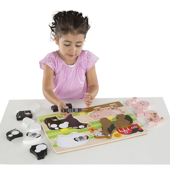 Rompecabezas de madera de piezas grandes con 4 animales de la granja y 20 piezas en total Tiene un adorable caballo, una oveja, un cerdo y una vaca en un tablero de rompecabezas Tiene ilustraciones coincidentes debajo de las piezas del rompecabezas que son fáciles de sujetar por manos pequeñas Ayuda a desarrollar las habilidades de conteo y motoras finas y el reconocimiento de animales y colores