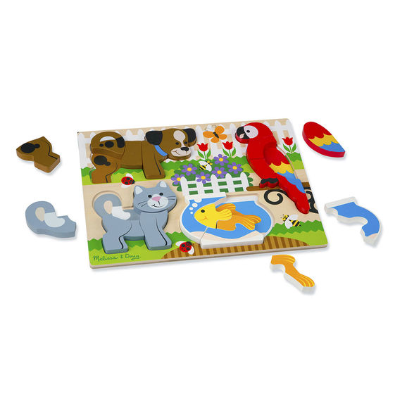 Rompecabezas de madera de piezas grandes con 4 animales y 20 piezas en total Cuenta con rompecabezas de un adorable perrito, un gatito, una lora y un pez de colores en un tablero de rompecabezas Tiene ilustraciones coincidentes debajo de las piezas del rompecabezas Ayuda a desarrollar las habilidades de conteo y motoras finas y el reconocimiento de animales y colores