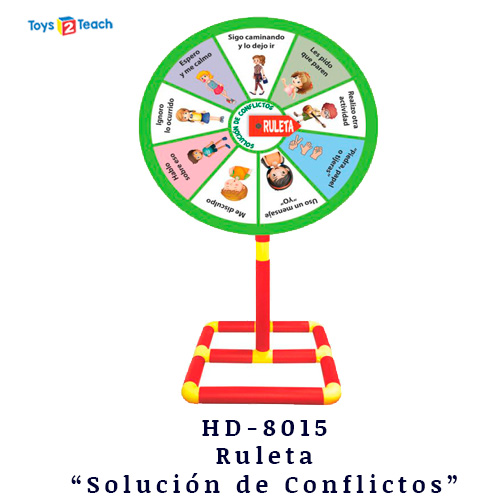 Ruleta “Solución de Conflictos” Al girar esta ruleta, se presentan diferentes situaciones conflictivas dentro de la escuela, lo que da lugar a una dinámica en la que el grupo propone diversas alternativas de solución. Presentación: 1 rueda de 53 cm y una base de tubo en plástico. Material: Plástico - Vinil - Madera. Nivel: Preescolar - Primaria
