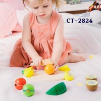Contenido 17 piezas. Medida: 24 x 24 x 2.5 cm ¿Quien quiere un trozo de manzana? ¡Los niños se divertiran cortando estas coloridas frutas, ya que presentan diseños realistas, ademas de tener innovadoras uniones que se pueden cortar facilmente con el cuchillo de madera dentado incluido. El kit tambien incluye una tabla de cortar. El niño desarrolla el juego de roles imaginativo, adquiere conocimientos sobre alimentos saludables y tambien practica sus habilidades motoras.