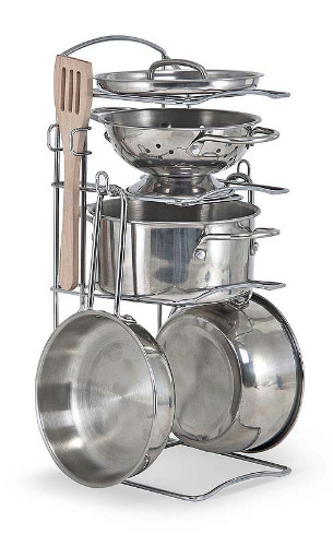 Edad: 3+, este juego cuenta con un set de utensilios de cocina de acero inoxidable brillante que mamá y papa envidiarán! de grandes dimensiones (diámetro de 5 pulgadas) para generar un aspecto y sensación ms realista, el colador y tres bandejas (con tapa intercambiable) se adaptan a la mayoría de los elementos en el juego de los alimentos en el restaurante y en la cocina, se almacena perfectamente en un estante adhoc cuando la cocina esta cerrada . todas las jaladeras y pomos cuentan con juntas remachadas, resistentes que no se debilitan y desgastaran como la soldadura o pegamento. se Incluyen dos utensilios de madera y piezas de acero inoxidable de acabado espejo.