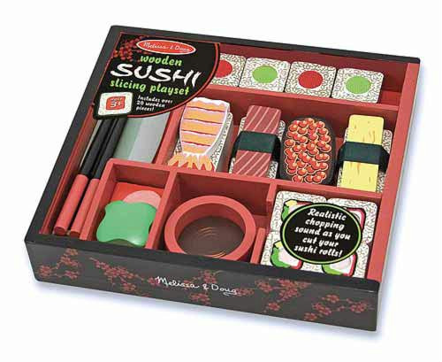 Edad: 3+, este elegante conjunto de 24 piezas de sushi de madera se empaca en una hermosa caja de almacenamiento e Incluye rollos de sushi, camarones, atún, palillos de fácil de usos, un cuchillo y mucho más. rollos de sushi que hacen sonidos realistas al corte!