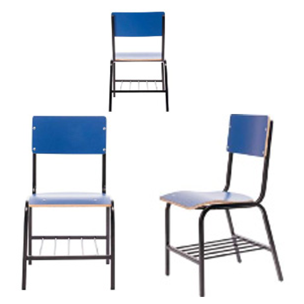 Estructura tubular redonda de 1" Calibre 18". Asiento y respaldo en triplay de pino de 12mm. Recubierto en laminado plástico. 5 diferentes colores. Con parrilla portalibros de ¼” en redondo macizo. Regatón de polipropileno antiderrapante ensamble a presión pegado a la estructura con adhesivos. Altura piso al asiento 45 cm. Ideal Primaria Alta +.