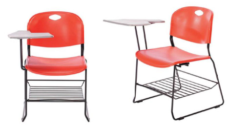 Asiento y respaldo en polipropileno de alta densidad en dos piezas separadas con forma anatómica; estructura en acero cold rolled, de diametro ½” (12.7mm)formada por dos asnillas laterales, con dos refuerzos frontal y posterior, lavada y fosfatizada a base pintura electrostatica micropulverizada horneada a 200° color negro ó aluminio. Herrajes para ensamble a base de presión, con tornillos phillips ¼” x 7/16”. Regatón de polipropileno antiderrapante ensamble a presión pegado a la estructura con adhesivos. papelera a base de parrilla en cold rolled de ¼” (6.3mm) soldadas al refuerzo en la parte frontal y posterior. Paleta en resina de poliestireno con aristas redondeadas, por la cara inferior se fijara a la charola del brazo soporte con 5 tuercas inserto en laton.