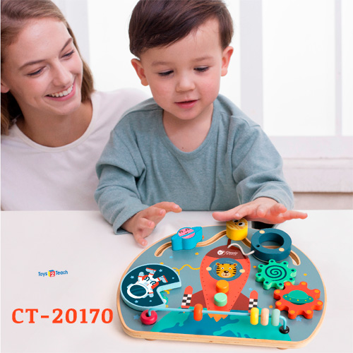 Medida 29 x 23.5 x 5.6 cm. Este tablero con tematica de cohete, combina sus funciones con los juegos de laberinto, engranes giratorios, cuentas etc.. . Los niños aprenderan aquello que puede encontrarse en nuestro sistema, como los planetas, el sol, el cohete, el astronauta etc. Ampliaran su vocabulario, desarrollaran su psicomotricidad fina, conoceran colores etc..