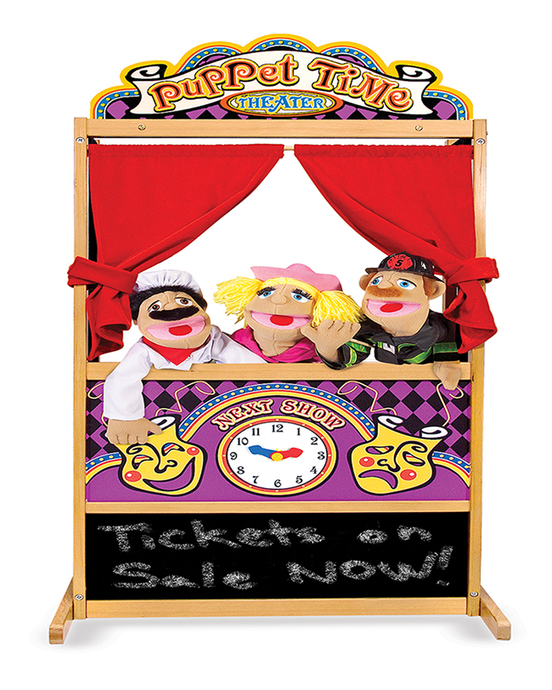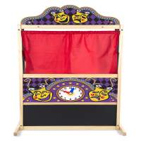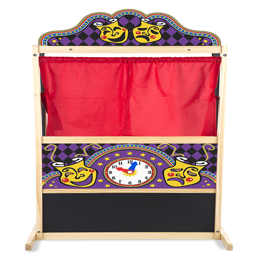 Edad: 3+, este teatro guiñol inspira la creatividad, la expresión y la imaginación de cualquier niño. Incluye un reloj con manecillas movibles y pizarrón para anunciar las funciones. tiene capacidad para dos niños con sus guiñoles. corre la cortina roja y que empiece la función
